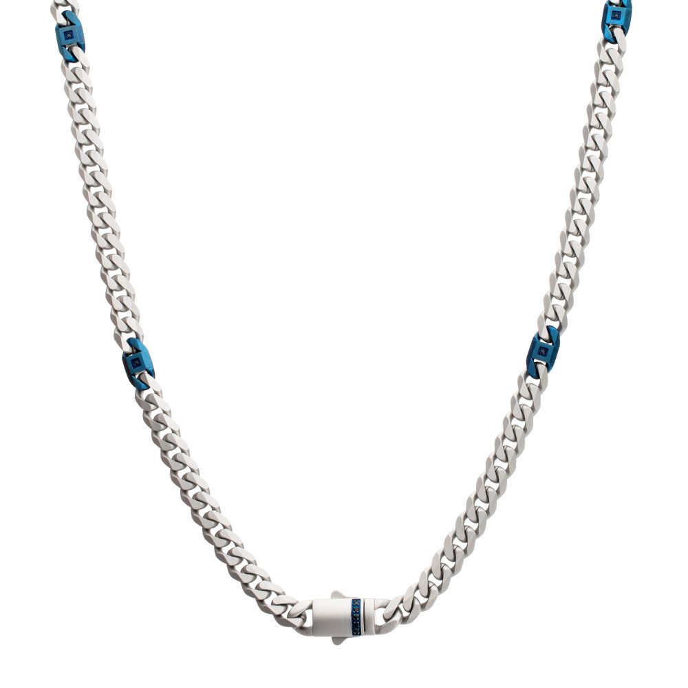 Matte Finish Steel Beveled Cuban with Blue Links Necklace